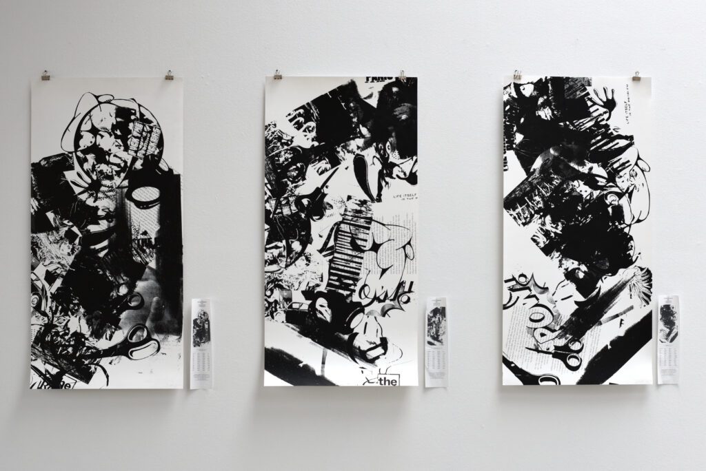 Multimedia installation, large-scale screenprints, receipt printer, computer