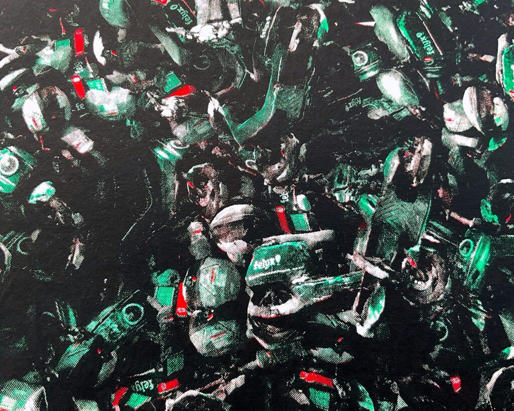 The original 3D scan was used in Blender as a particule simulation to create a chaotic mess of Felyx scooters. You can check and buy the print here.